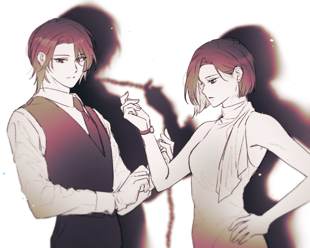 뭐랄까... 정장... 드레스... 이런 것들은 아무래도 '대외적인' 모습이잖아요 그들도 사회생활을 하는 사람들일 것이고, 그러면 공적인 장소에서 각자 수행하는 역할이 있을테니까.... 공적인 페르소나는 가시적이고 그래서 생각보다 거리감이 있을 수도 있겠다... 싶어서요 그리고 그와 별개로 그 뒤에 그들의 "진짜 관계성"은 이런 느낌~ 을 표현하고 싶어서 (ㅋㅋ) 고민하다가 이렇게 작업해보았습니다...